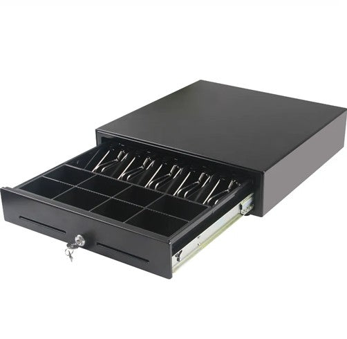 Cajón de seguridad con apertura automática, ideal para almacenar efectivo de manera ordenada y segura.